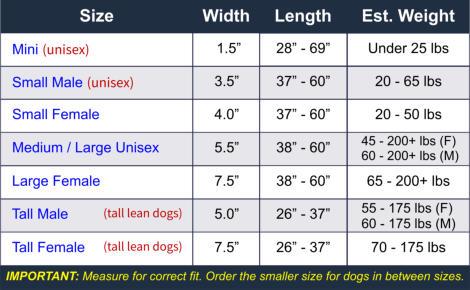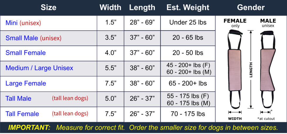 Pad Width Measure from the front of the hind legs (in front of the penis for male dogs) to the base of the rib cage to determine the support pad width. For barrel chested dogs (i.e. Boxers), downsizing is common. Support pads do not bunch up, so order the smaller size for dogs in between sizes. Still not sure? Try the Towel Test FEMALE DOGS Fold a bath towel to 7.5 inches wide to simulate the Large Female GingerLead, then sling it under her belly. If that's too big, then re-fold the towel to 5.5 inches wide to simulate the Medium/Large GingerLead. If that's too big, then re-fold the towel to 4 inches wide to simulate the Small Female GingerLead. If the small is too big for her, try our Mini GingerLead. MALE DOGS Fold a bath towel to 5.5 inches wide to simulate the Medium/Large GingerLead, then sling it under your dog's belly in front of his penis. If that's too big, then re- fold the towel to 3.5 inches wide to simulate the Small Male GingerLead. If that's too big, try our Mini GingerLead. Male Dachshunds typically use the Mini GingerLead with the sling behind their penis. Strap Length Includes support pad, straps, handle AND space between your hand and your dog’s back. Measure your dog starting where the handle of the GingerLead will rest in your hand (while you are standing upright), continue under your dog’s belly, up the other side, then back to your hand completing the loop. If it measures 37” or less, order the tall size. Check with your veterinarian if you have any questions about whether a GingerLead will fit your dog's needs given their specific medical condition(s).
